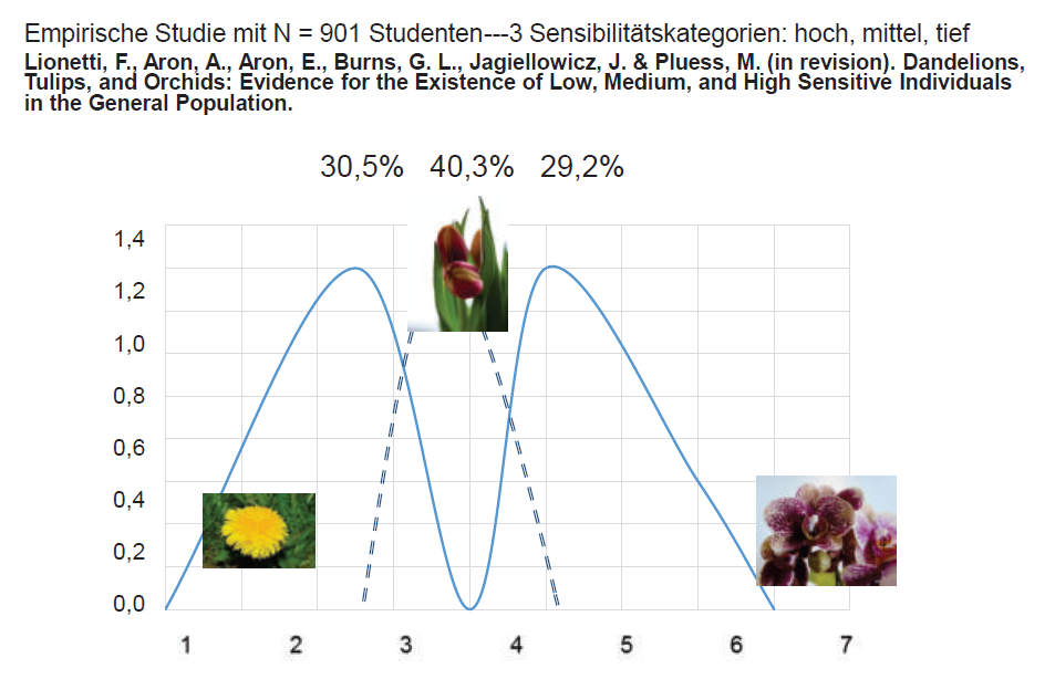 Sie stellten in ihrer Studie fest, dass etwa 30% eine besonders hohe Sensibilität aufwiesen, welche für sie die Gruppe der „Orchideen“ darstellt. Dem gegenüber konnten die Forscher aber auch eine Gruppe von etwa 30% mit relativ geringer Sensibilität identifizieren und ordneten diese den „Löwenzähnen“ zu. Tatsächlich fanden Michael Pluess und sein Team aber noch eine dritte Gruppe mit einem mittleren Sensibilitätsniveau, welches somit zwischen Orchideen und Löwenzahn liegt und mit 40% die größte der drei Gruppen darstellt. Sie nannten dann in Anlehnung an die Blumen- Metapher diese Gruppe „Tulpen“, da sie nicht so robust wie Löwenzahn, aber auch nicht so zart wie Orchideen sind.